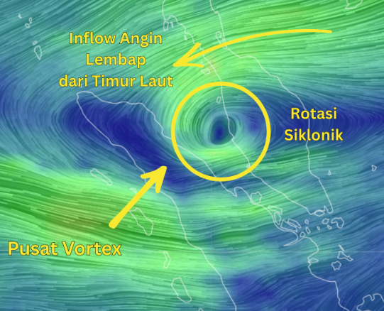 Menurut Dr. Rais, fenomena atmosfer yang memperkuat hujan ekstrem ini menunjukkan ciri khas adanya pusaran atau sirkulasi siklonik di sekitar wilayah Sumatera bagian utara.