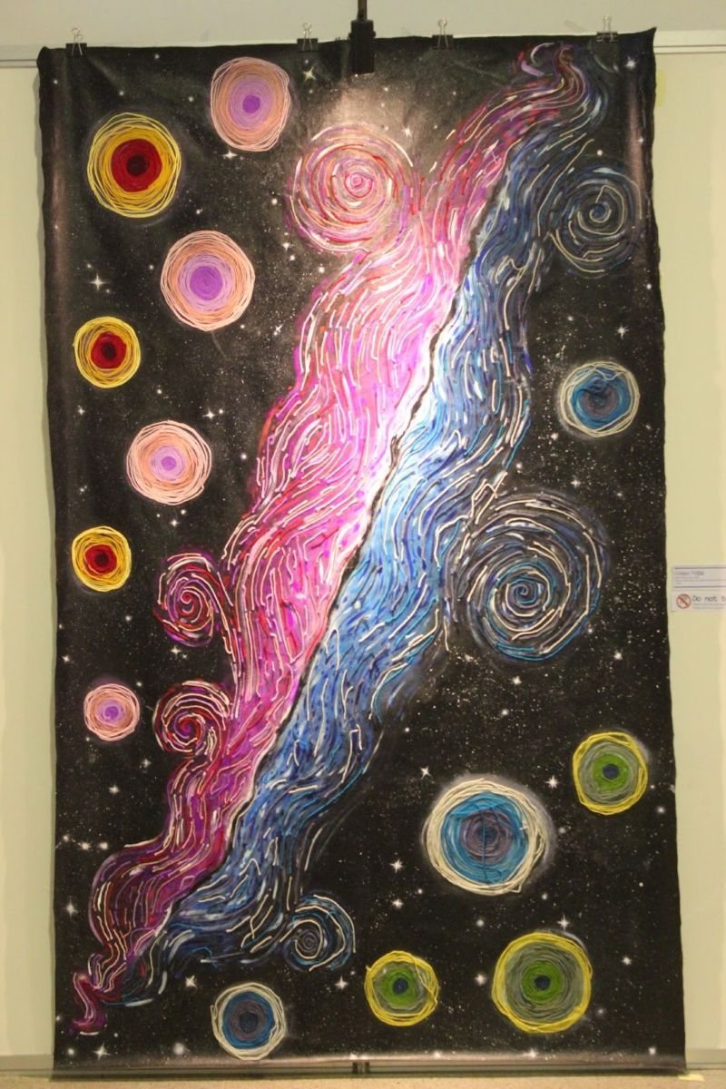Lukisan berukuran 2,5 meter itu menggambarkan semesta dan dunia mikroba sebagai dua realitas yang sama-sama luas dan misterius. Ia menggunakan dua medium, cat dan benang, yang melambangkan perpaduan struktur dan kebebasan.