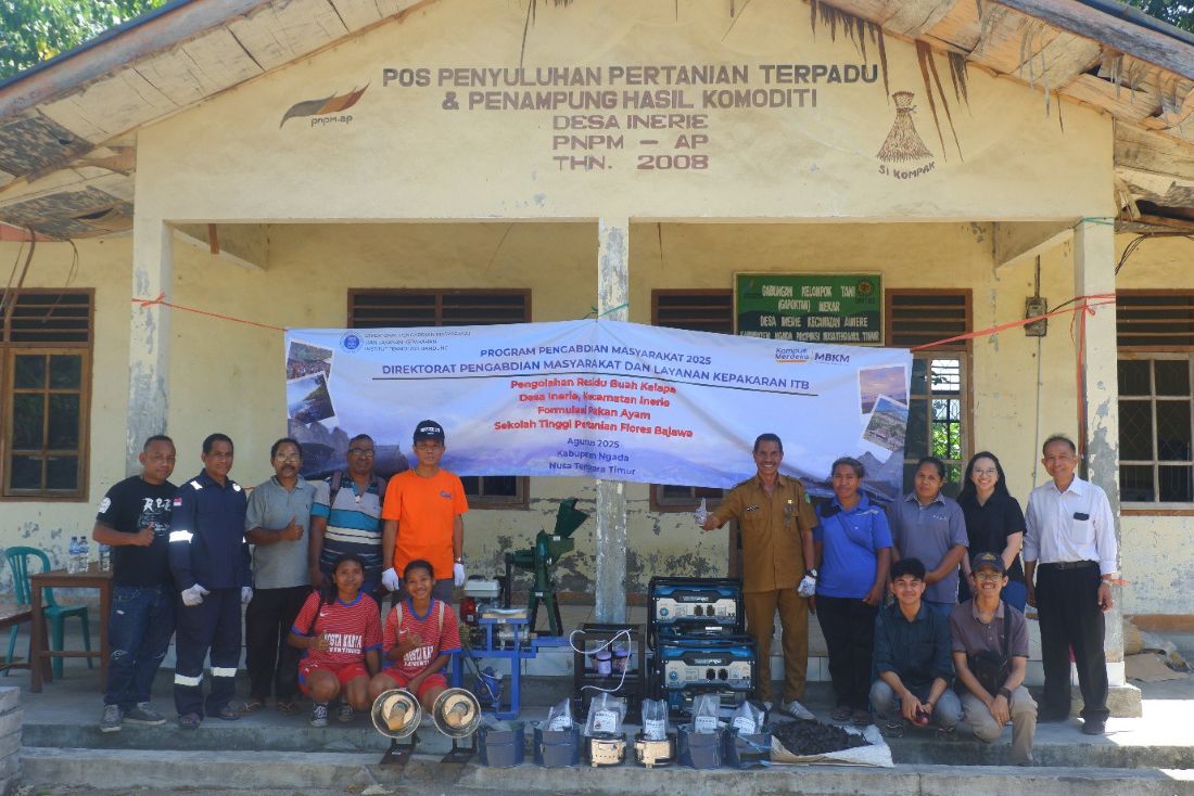 NGADA, itb.ac.id—Tim dosen dan mahasiswa Institut Teknologi Bandung (ITB) dari Fakultas Teknologi Industri (FTI) melakukan pengabdian kepada masyarakat di Kabupaten Ngada, Nusa Tenggara Timur, Senin (11/8/2025) hingga Rabu (13/8/2025). Kegiatan ini dikoordinasikan dan didanai oleh Direktorat Pengabdian Masyarakat dan Layanan Kepakaran (DPMK) ITB, dengan fokus pada dua topik utama, yaitu pengolahan residu tempurung kelapa menjadi briket arang dan formulasi pakan ternak ayam petelur berbasis limbah pertanian lokal.