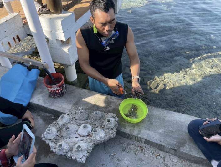 Penjelasan terkait transplantasi karang di Pulau Pramuka, Minggu (11/5/2025). (Dok. Praktikan Kuliah Lapangan Ekologi Laut)