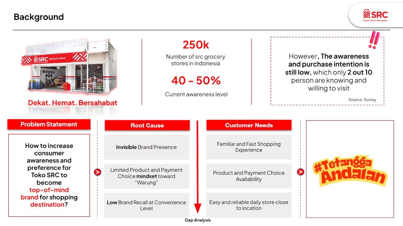 Kasus yang diangkat dalam kompetisi ini berfokus pada peningkatan brand awareness dan consumer preference terhadap Toko SRC (Sampoerna Retail Community), jaringan toko kelontong modern terbesar di Indonesia. Meskipun keberadaannya masif dan identik dengan banner merah, tingkat awareness masyarakat dinilai masih dapat ditingkatkan melalui strategi komunikasi yang lebih relevan dan terintegrasi.