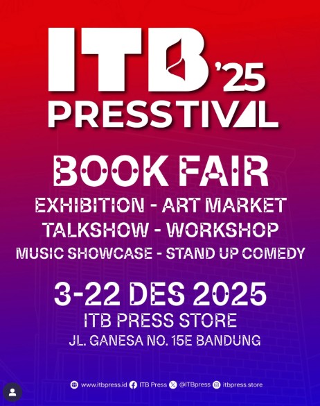 Menutup akhir tahun 2025, ITB Press mempersembahkan ITB Presstival. Sebuah perayaan yang menghadirkan book fair, diskon spesial produk ITB Press, exhibition, art market, talkshow, workshop, dan music showcase.