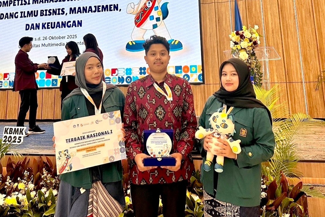 BANDUNG, itb.ac.id - The CaseCrushers Team, consisting of Harits Imtiyaaz Tresna Putra, Kania Azra Putri Fahlepi, and Ayesha Ghaisani, students from the School of Business and Management, Institut Teknologi Bandung (SBM ITB), won First Place at the 2025 National Student Competition on Management and Finance (KBMK) in the category of Appropriate Technology Commercialization. The competition was organized by the Directorate of Learning and Student Affairs (Belmawa), Directorate General of Higher Education, Ministry of Education, Culture, Research, and Technology of Indonesia (DIKTI) on August 26, 2025.