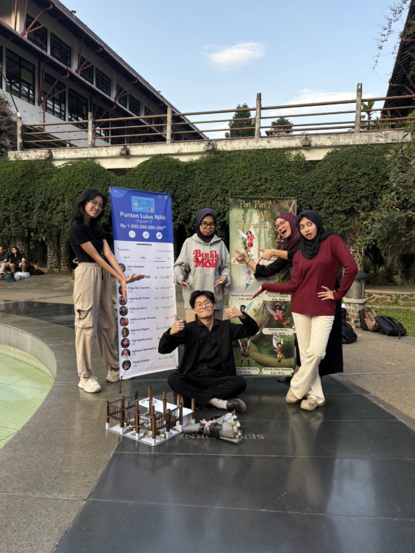 Evan with his scale model and friends after his undergraduate thesis defense at Kolam Indonesia Tenggelam, ITB Ganesha Campus, July 2025. (Dok. Pribadi)