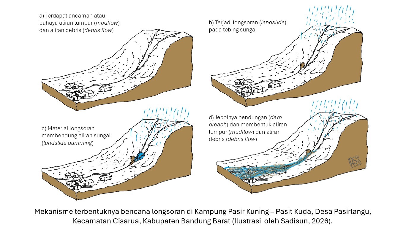 BANDUNG, itb.ac.id - The landslide that occurred in West Bandung Regency (KBB) on January 24, 2026, should not be understood solely as a consequence of land-use change. Landslide geology expert from Institut Teknologi Bandung (ITB), Dr. Eng. Imam A. Sadisun, emphasized that the event resulted from a complex interaction between natural geological processes and human activities, leading to a mudflow mechanism triggered by landslides in the upstream section of the slope–river system.