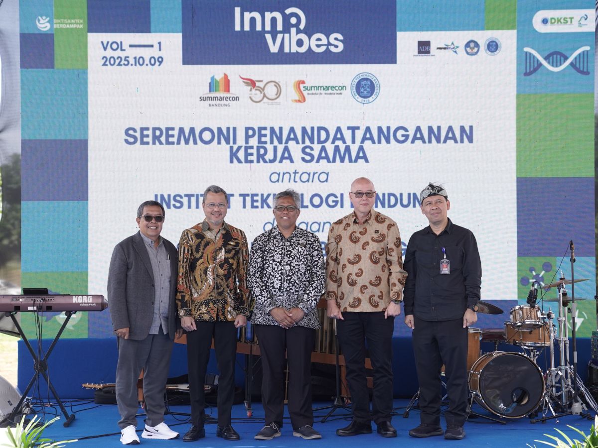 Rektor ITB, Prof. Dr. Ir. Tatacipta Dirgantara, M.T. dan Direktur Utama PT Mahkota Permata Perdana sekaligus Excecutive Director Summarecon Bandung, Hindarko Hasan, menandatangani perjanjian kerja sama antara ITB dan PT Summarecon Agung Tbk., melalui anak perusahaannya, PT Mahkota Permata Perdana untuk pengembangan kawasan inovasi di ITB Innovation Park Technopolis, Summarecon, Bandung, Kamis (9/10/2025).