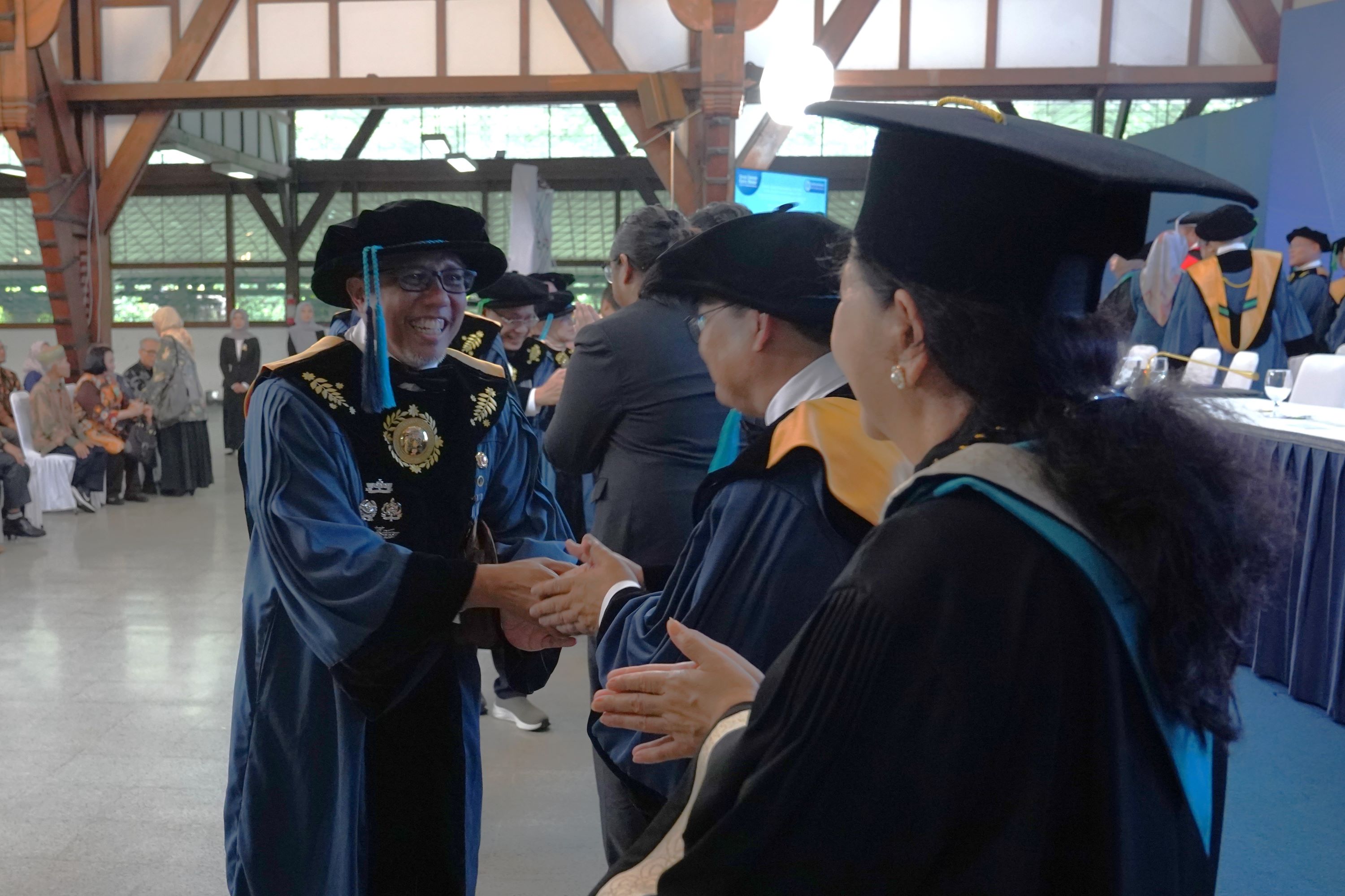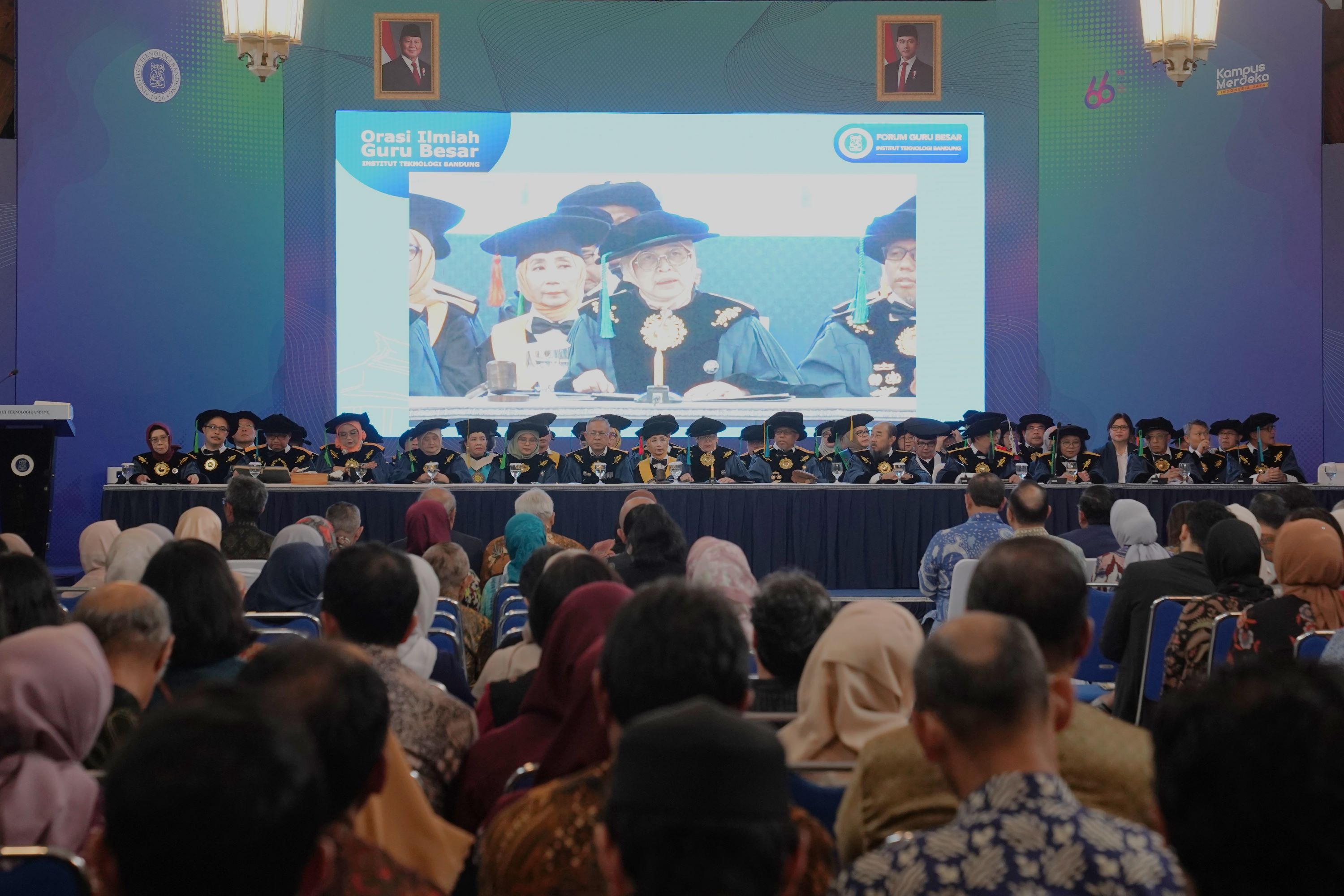 Rektor ITB, Prof. Dr. Ir. Tatacipta Dirgantara, M.T., menghadiri Orasi Ilmiah Guru Besar di Aula Barat, ITB Kampus Ganesha, Sabtu (24/5/2025). Empat Guru Besar yang menyampaikan orasinya antara lain Prof. Dr. Deana Wahyuningrum, S.Si., M.Si. (Fakultas Matematika dan Ilmu Pengetahuan Alam/FMIPA), Prof. Dr. Rizkita Rachmi Esyanti (Sekolah Ilmu dan Teknologi Hayati/SITH), Prof. Dr. apt. Ilma Nugrahani, S.Farm., M.Si. (Sekolah Farmasi/SF), dan Prof. Ir. Andojo Wurjanto, MCE., Ph.D. (Fakultas Teknik Sipil dan Lingkungan/FTSL).