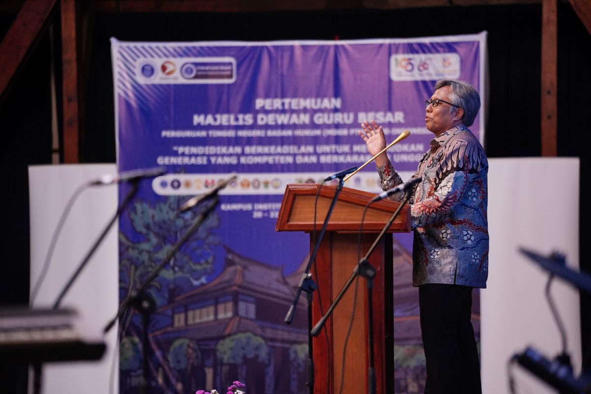 Rektor ITB, Prof. Dr. Ir. Tatacipta Dirgantara, M.T. membuka Pertemuan Majelis Dewan Guru Besar Perguruan Tinggi Negeri Badan Hukum (MDGB-PTNBH) se-Indonesia yang digelar di Aula Timur, ITB Kampus Ganesha, Kamis (20/11/2025). Pada tahun ini, ITB menjadi tuan rumah agenda tersebut, dengan mengusung tema “Pendidikan Berkeadilan untuk Mewujudkan Generasi yang Kompeten dan Berkarakter Unggul”.