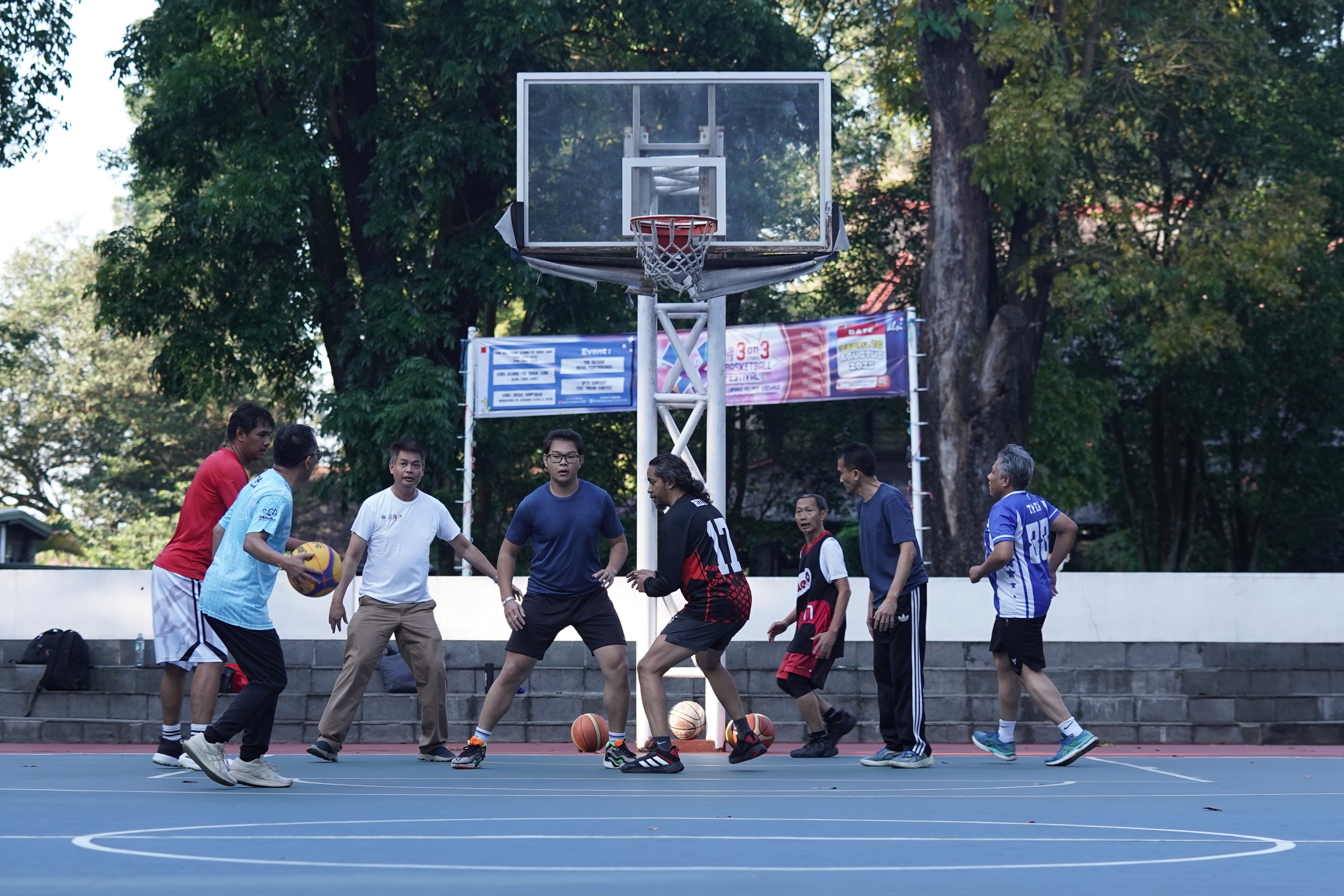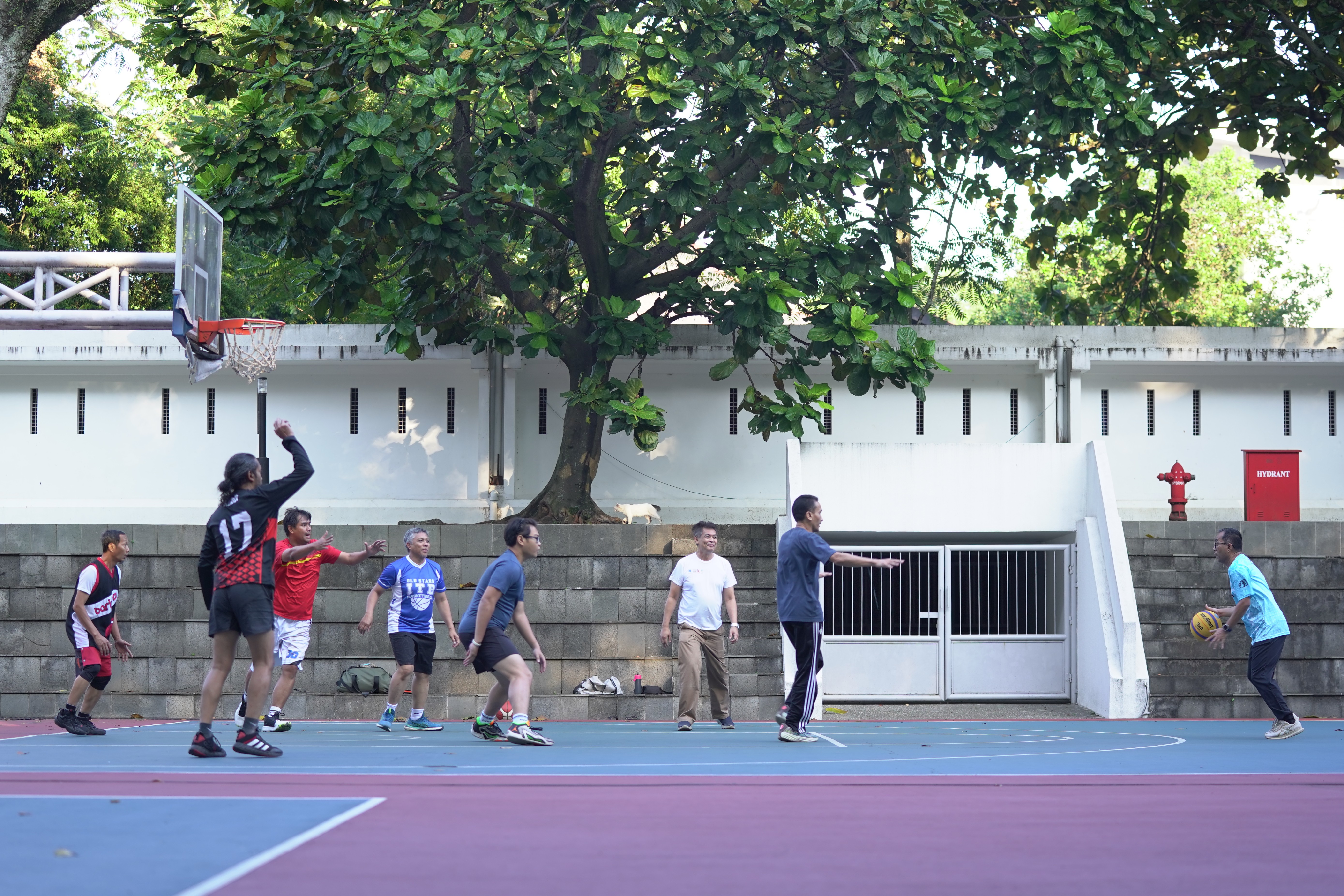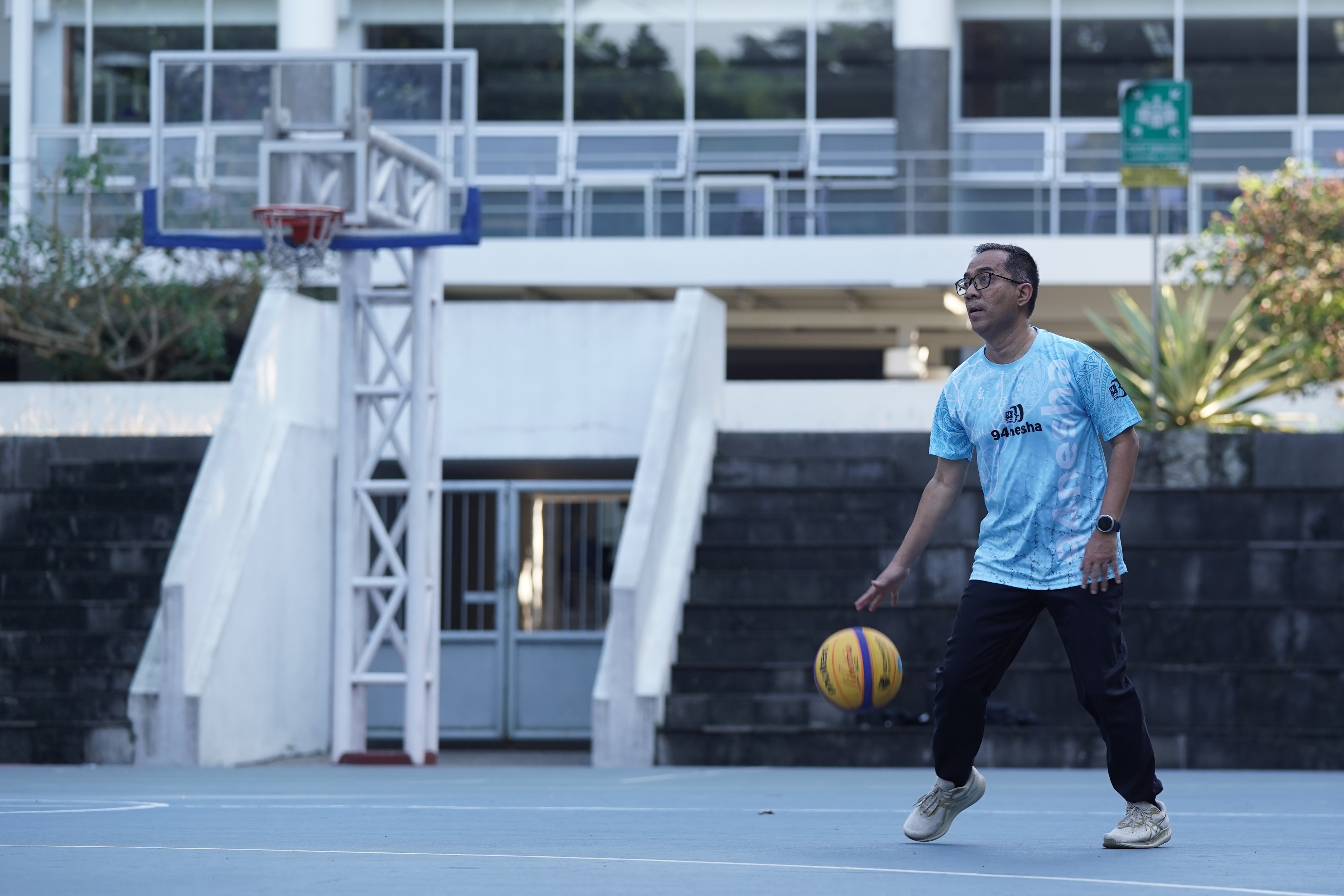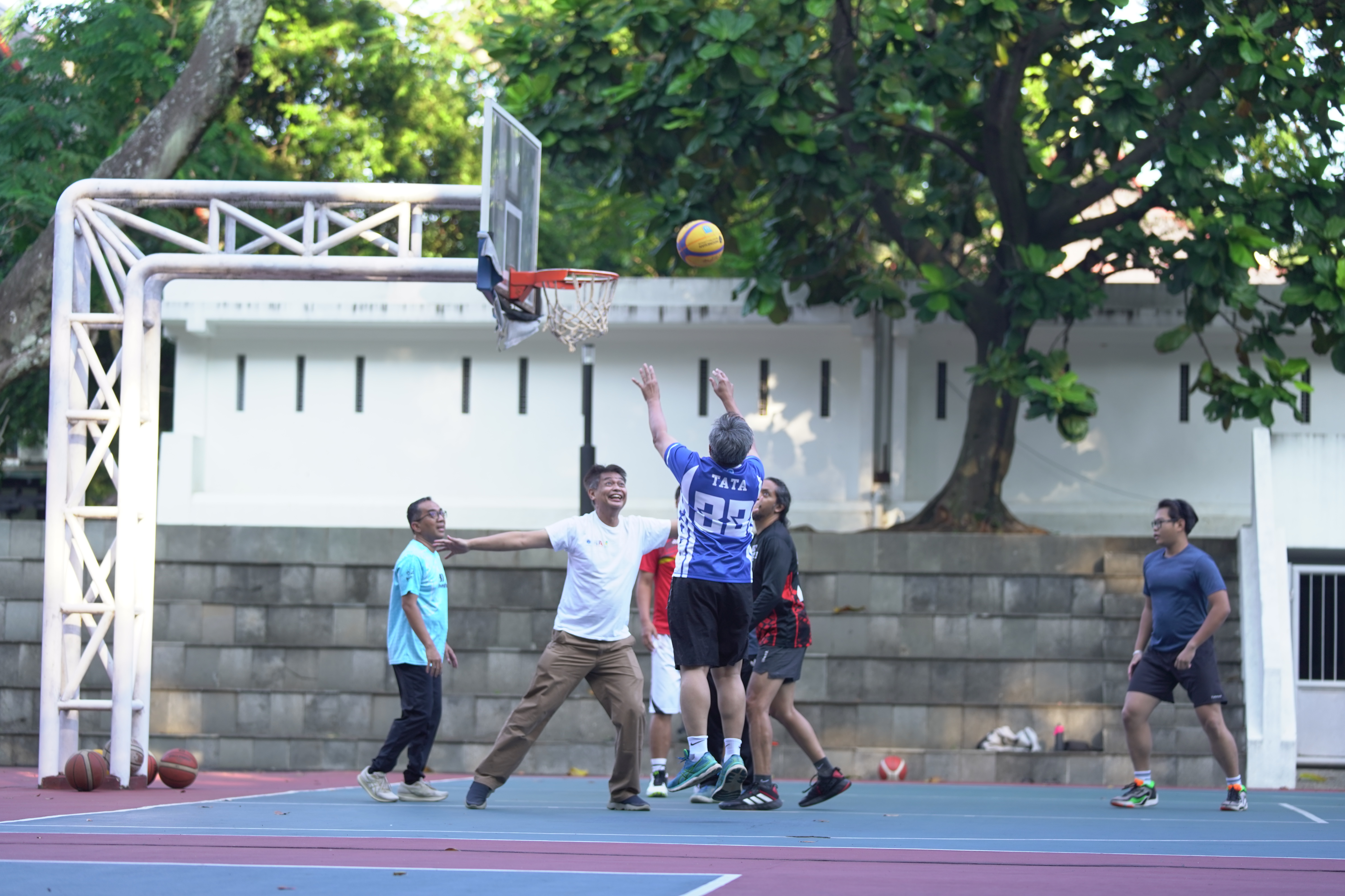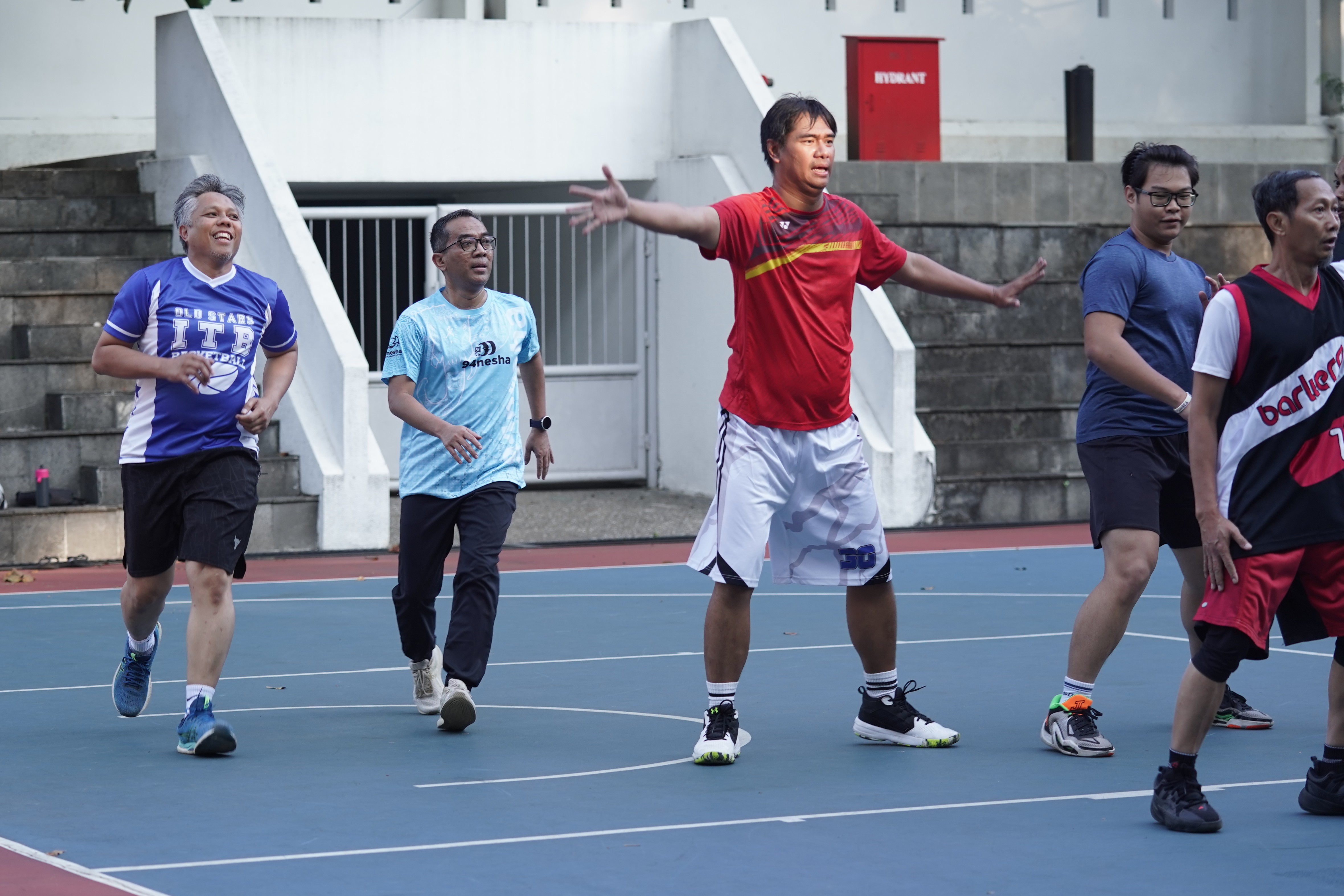 Rektor ITB, Prof. Dr. Ir. Tatacipta Dirgantara, M.T. dan Menteri Pendidikan Tinggi, Sains, dan Teknologi, Prof. Brian Yuliarto, S.T., M.Eng., Ph.D., beserta sejumlah dosen dan mahasiswa melakukan olahraga basket di lapangan basket, ITB Kampus Ganesha, Sabtu (2/8/2025).