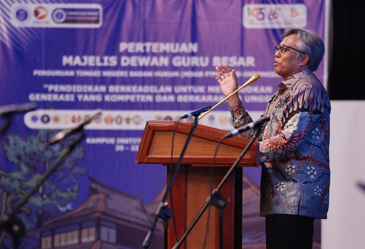 Rektor ITB, Prof. Dr. Ir. Tatacipta Dirgantara, M.T. menghadiri Pertemuan Majelis Dewan Guru Besar Perguruan Tinggi Negeri Badan Hukum (MDGB-PTNBH) se-Indonesia, Jumat (21/11/2025). Pada tahun ini, ITB menjadi tuan rumah pertemuan tersebut yang mengusung tema “Pendidikan Berkeadilan untuk Mewujudkan Generasi yang Kompeten dan Berkarakter Unggul”. Prof. Tata menyampaikan apresiasi atas kepercayaan kepada ITB sebagai tuan rumah forum akademik nasional tersebut. Beliau menegaskan bahwa Dewan Guru Besar memiliki peran penting dalam menghasilkan pemikiran strategis, menjaga nilai luhur, dan merumuskan keilmuan masa depan. Rektor menekankan bahwa tema pertemuan sangat relevan dalam menjawab tantangan pendidikan tinggi saat ini, termasuk bagaimana perguruan tinggi dapat mencetak lulusan yang berintegritas, adaptif, dan mampu bersaing di tingkat global. Ia berharap rekomendasi yang dirumuskan dapat digunakan sebagai policy brief untuk memperkuat kebijakan pendidikan tinggi nasional.